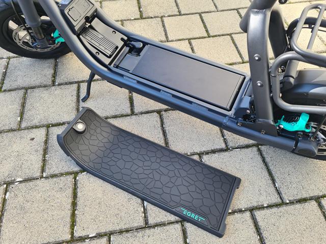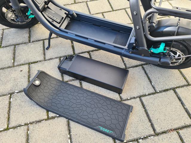 Die Li-Ion Batterie des Egret GTs erfüllt die neusten und strengsten Sicherheitsstandards für Batterien gemäß EN 50604-1. Über die bisherigen Standards hinaus beinhaltet diese Norm u.a. die Prüfung unter extremer Last, zusätzliche mechanische Tests wie Quetschtests, Temperaturschocks und simulierte Unfälle. Sicherer kann eine Batterie und ein E-Scooter aktuell nicht sein! Der leistungsstarke 48 V Schnellwechsel-Akku unter dem Trittbrett lässt sich mit einem Handgriff entnehmen und an jeder Steckdose laden.